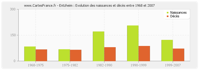Entzheim : évolution des naissances et décès de 1968 à 2007