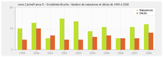 - Ernolsheim-Bruche en 2008 : 18 naissances et 12 décès