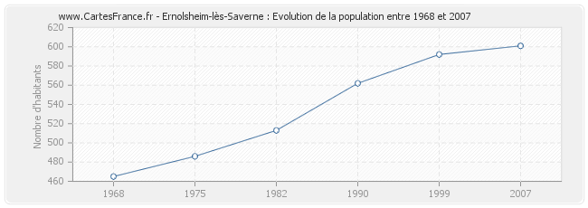 La population d'Ernolsheim-lès-Saverne était de 601 habitants en 2007, 592 habitants en 1999, 562 habitants en 1990, 513 habitants en 1982, 486 habitants en 1975 et 465 habitants en 1968.