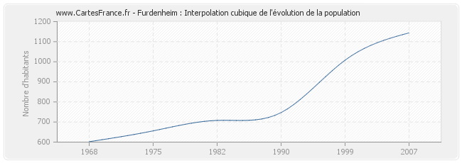Cette courbe reprend l'historique de la population de Furdenheim de 1968 à 2007 en interpolation cubique. Ceci permet d'obtenir plus précisément la population de la commune de Furdenheim les années ou aucun recensement n'a été effectué.