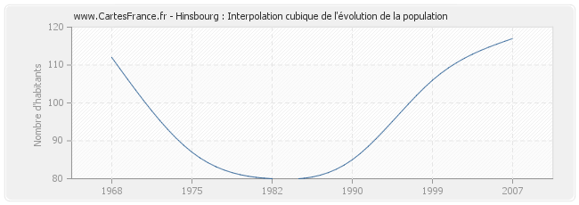 Cette courbe reprend l'historique de la population de Hinsbourg de 1968 à 2007 en interpolation cubique. Ceci permet d'obtenir plus précisément la population de la commune de Hinsbourg les années ou aucun recensement n'a été effectué.