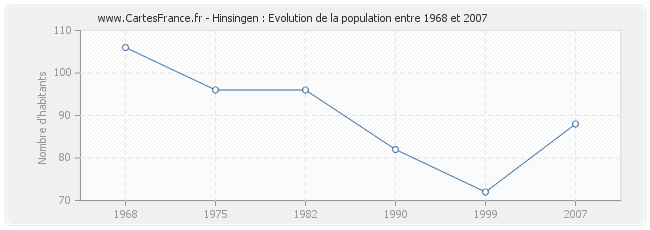 La population de Hinsingen était de 88 habitants en 2007, 72 habitants en 1999, 82 habitants en 1990, 96 habitants en 1982, 96 habitants en 1975 et 106 habitants en 1968.