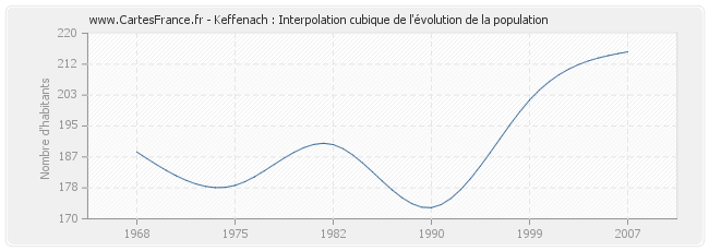 Cette courbe reprend l'historique de la population de Keffenach de 1968 à 2007 en interpolation cubique. Ceci permet d'obtenir plus précisément la population de la commune de Keffenach les années ou aucun recensement n'a été effectué.