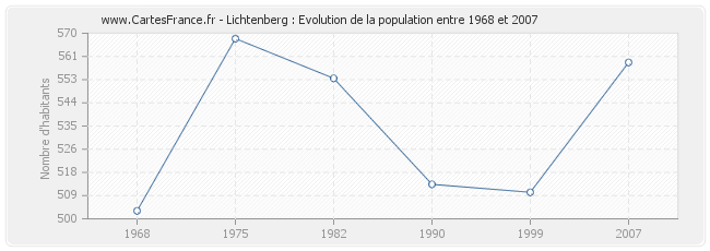 La population de Lichtenberg était de 559 habitants en 2007, 510 habitants en 1999, 513 habitants en 1990, 553 habitants en 1982, 568 habitants en 1975 et 503 habitants en 1968.