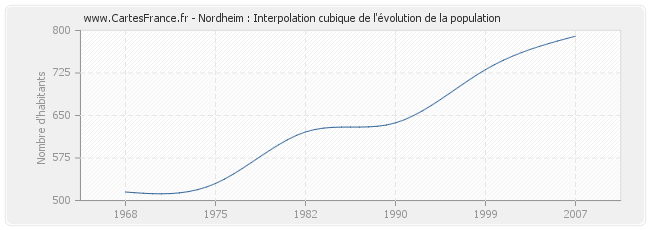 Cette courbe reprend l'historique de la population de Nordheim de 1968 à 2007 en interpolation cubique. Ceci permet d'obtenir plus précisément la population de la commune de Nordheim les années ou aucun recensement n'a été effectué.