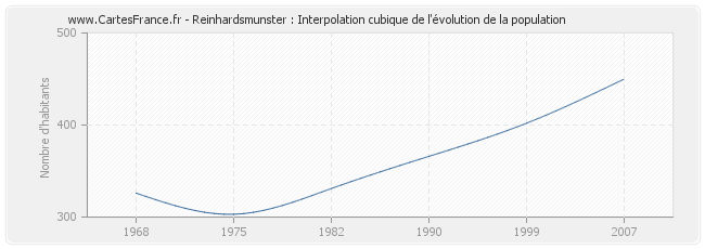 Cette courbe reprend l'historique de la population de Reinhardsmunster de 1968 à 2007 en interpolation cubique. Ceci permet d'obtenir plus précisément la population de la commune de Reinhardsmunster les années ou aucun recensement n'a été effectué.