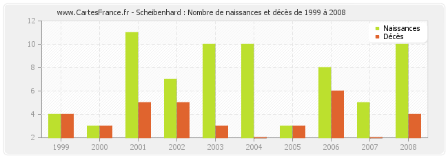 - Scheibenhard en 2008 : 10 naissances et 4 décès