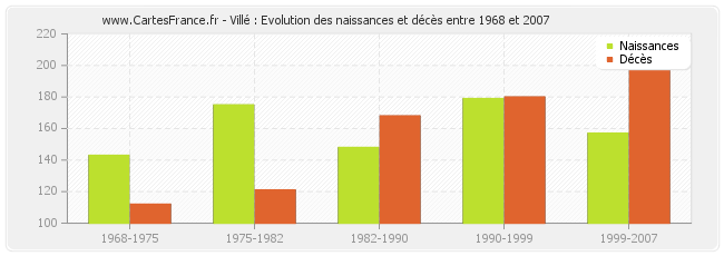 La population de Villé était de 1 736 habitants en 2007, 1 743 habitants en 1999, 1 550 habitants en 1990, 1 616 habitants en 1982, 1 530 habitants en 1975 et 1 422 habitants en 1968.