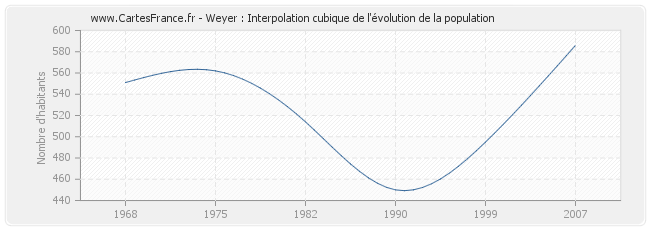 Cette courbe reprend l'historique de la population de Weyer de 1968 à 2007 en interpolation cubique. Ceci permet d'obtenir plus précisément la population de la commune de Weyer les années ou aucun recensement n'a été effectué.