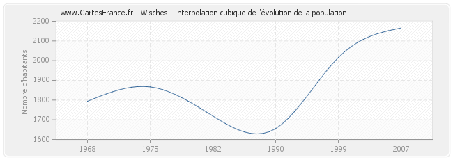 Cette courbe reprend l'historique de la population de Wisches de 1968 à 2007 en interpolation cubique. Ceci permet d'obtenir plus précisément la population de la commune de Wisches les années ou aucun recensement n'a été effectué.