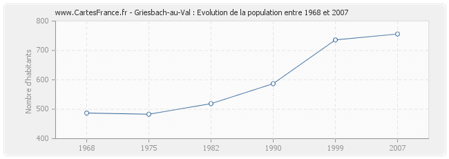 La population de Griesbach-au-Val était de 756 habitants en 2007, 736 habitants en 1999, 587 habitants en 1990, 519 habitants en 1982, 483 habitants en 1975 et 487 habitants en 1968.