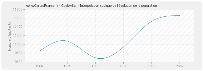 Cette courbe reprend l'historique de la population de Guebwiller de 1968 à 2007 en interpolation cubique. Ceci permet d'obtenir plus précisément la population de la commune de Guebwiller les années ou aucun recensement n'a été effectué.