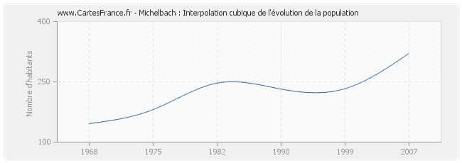 Cette courbe reprend l'historique de la population de Michelbach de 1968 à 2007 en interpolation cubique. Ceci permet d'obtenir plus précisément la population de la commune de Michelbach les années ou aucun recensement n'a été effectué.