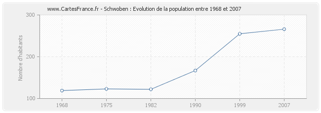 Cette courbe reprend l'historique de la population de Schwoben de 1968 à 2007 en interpolation cubique. Ceci permet d'obtenir plus précisément la population de la commune de Schwoben les années ou aucun recensement n'a été effectué.