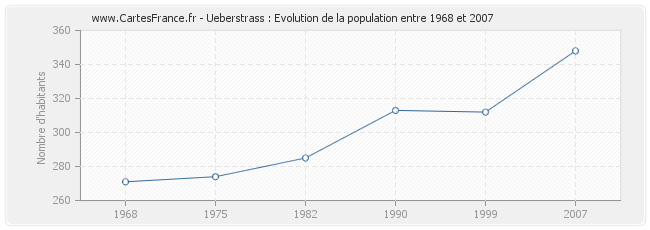 La population d'Ueberstrass était de 348 habitants en 2007, 312 habitants en 1999, 313 habitants en 1990, 285 habitants en 1982, 274 habitants en 1975 et 271 habitants en 1968.