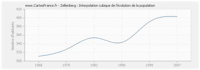 Cette courbe reprend l'historique de la population de Zellenberg de 1968 à 2007 en interpolation cubique. Ceci permet d'obtenir plus précisément la population de la commune de Zellenberg les années ou aucun recensement n'a été effectué.