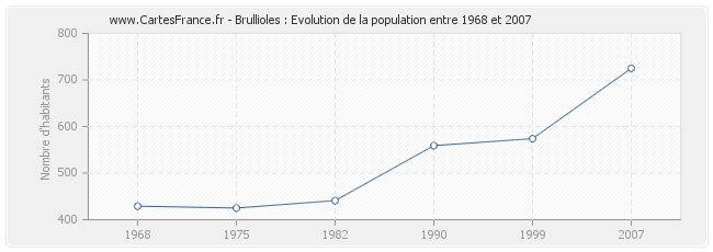 La population de Brullioles était de 725 habitants en 2007, 574 habitants en 1999, 559 habitants en 1990, 441 habitants en 1982, 425 habitants en 1975 et 429 habitants en 1968.