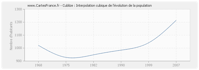 Cette courbe reprend l'historique de la population de Cublize de 1968 à 2007 en interpolation cubique. Ceci permet d'obtenir plus précisément la population de la commune de Cublize les années ou aucun recensement n'a été effectué.