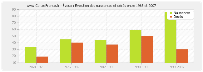 Éveux : évolution des naissances et décès de 1968 à 2007