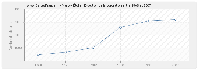 La population de Marcy-l'Étoile était de 3 199 habitants en 2007, 3 092 habitants en 1999, 2 599 habitants en 1990, 1 033 habitants en 1982, 683 habitants en 1975 et 484 habitants en 1968.