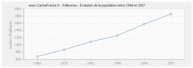 La population de Pollionnay était de 1 858 habitants en 2007, 1 580 habitants en 1999, 1 262 habitants en 1990, 1 088 habitants en 1982, 866 habitants en 1975 et 676 habitants en 1968.