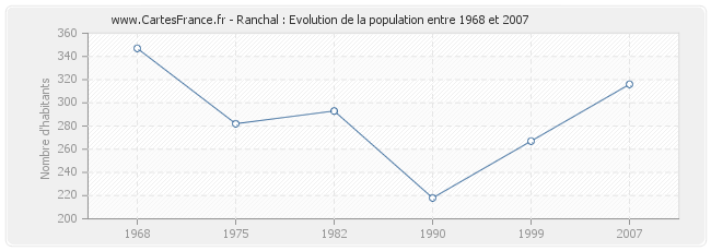 Cette courbe reprend l'historique de la population de Ranchal de 1968 à 2007 en interpolation cubique. Ceci permet d'obtenir plus précisément la population de la commune de Ranchal les années ou aucun recensement n'a été effectué.