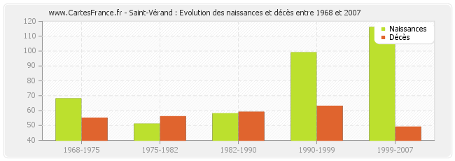Saint-Vérand : évolution des naissances et décès de 1968 à 2007