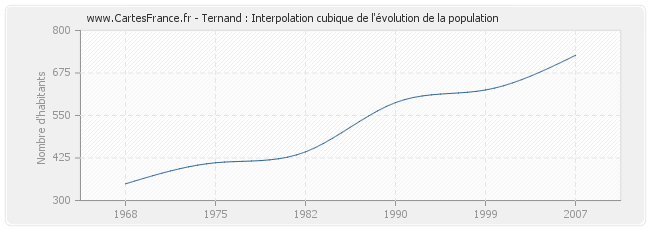 Cette courbe reprend l'historique de la population de Ternand de 1968 à 2007 en interpolation cubique. Ceci permet d'obtenir plus précisément la population de la commune de Ternand les années ou aucun recensement n'a été effectué.