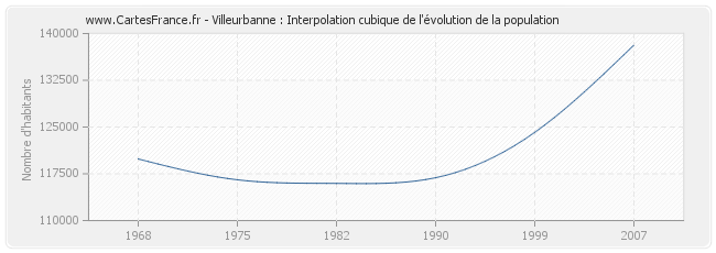Cette courbe reprend l'historique de la population de Villeurbanne de 1968 à 2007 en interpolation cubique. Ceci permet d'obtenir plus précisément la population de la commune de Villeurbanne les années ou aucun recensement n'a été effectué.