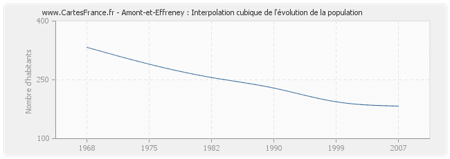 Cette courbe reprend l'historique de la population d'Amont-et-Effreney de 1968 à 2007 en interpolation cubique. Ceci permet d'obtenir plus précisément la population de la commune d'Amont-et-Effreney les années ou aucun recensement n'a été effectué.