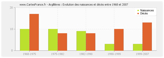 Argillières : évolution des naissances et décès de 1968 à 2007