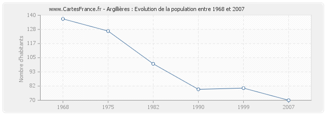La population d'Argillières était de 70 habitants en 2007, 80 habitants en 1999, 79 habitants en 1990, 100 habitants en 1982, 127 habitants en 1975 et 137 habitants en 1968.