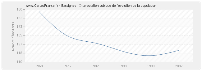Cette courbe reprend l'historique de la population de Bassigney de 1968 à 2007 en interpolation cubique. Ceci permet d'obtenir plus précisément la population de la commune de Bassigney les années ou aucun recensement n'a été effectué.