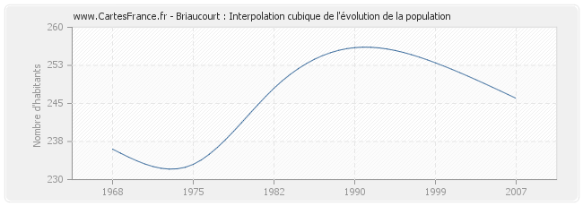 Cette courbe reprend l'historique de la population de Briaucourt de 1968 à 2007 en interpolation cubique. Ceci permet d'obtenir plus précisément la population de la commune de Briaucourt les années ou aucun recensement n'a été effectué.