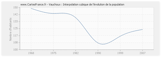 Cette courbe reprend l'historique de la population de Vauchoux de 1968 à 2007 en interpolation cubique. Ceci permet d'obtenir plus précisément la population de la commune de Vauchoux les années ou aucun recensement n'a été effectué.