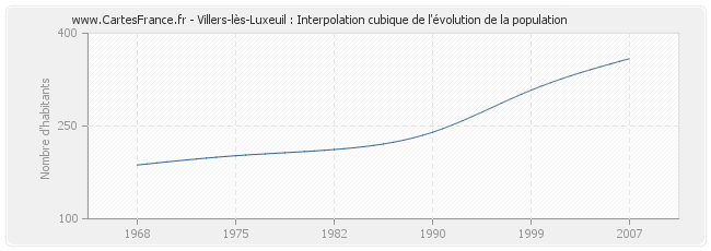 Cette courbe reprend l'historique de la population de Villers-lès-Luxeuil de 1968 à 2007 en interpolation cubique. Ceci permet d'obtenir plus précisément la population de la commune de Villers-lès-Luxeuil les années ou aucun recensement n'a été effectué.