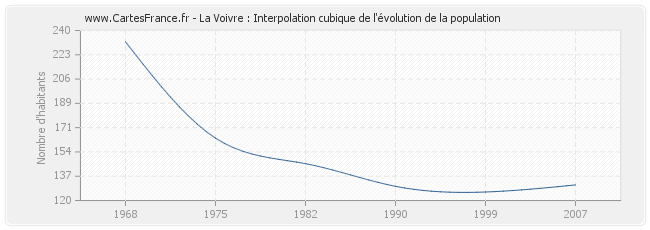 Cette courbe reprend l'historique de la population de La Voivre de 1968 à 2007 en interpolation cubique. Ceci permet d'obtenir plus précisément la population de la commune de La Voivre les années ou aucun recensement n'a été effectué.