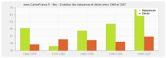La population de Bey était de 760 habitants en 2007, 633 habitants en 1999, 554 habitants en 1990, 504 habitants en 1982, 388 habitants en 1975 et 353 habitants en 1968.
