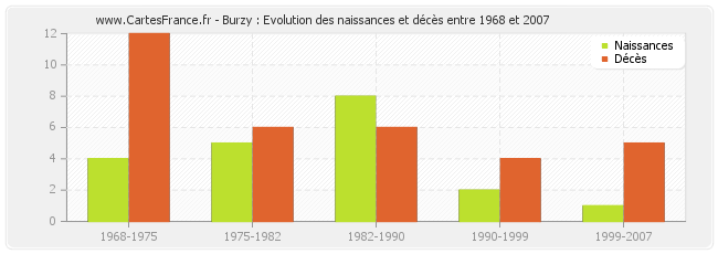 Burzy : évolution des naissances et décès de 1968 à 2007