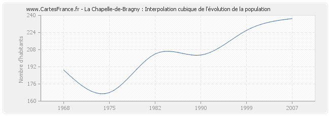 Cette courbe reprend l'historique de la population de La Chapelle-de-Bragny de 1968 à 2007 en interpolation cubique. Ceci permet d'obtenir plus précisément la population de la commune de La Chapelle-de-Bragny les années ou aucun recensement n'a été effectué.