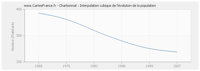 Cette courbe reprend l'historique de la population de Charbonnat de 1968 à 2007 en interpolation cubique. Ceci permet d'obtenir plus précisément la population de la commune de Charbonnat les années ou aucun recensement n'a été effectué.