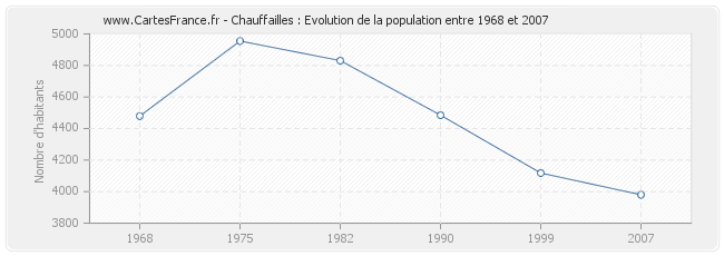La population de Chauffailles était de 3 980 habitants en 2007, 4 118 habitants en 1999, 4 485 habitants en 1990, 4 831 habitants en 1982, 4 955 habitants en 1975 et 4 479 habitants en 1968.