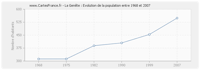 Cette courbe reprend l'historique de la population de La Genête de 1968 à 2007 en interpolation cubique. Ceci permet d'obtenir plus précisément la population de la commune de La Genête les années ou aucun recensement n'a été effectué.