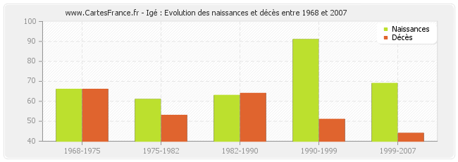 Cette courbe reprend l'historique de la population d'Igé de 1968 à 2007 en interpolation cubique. Ceci permet d'obtenir plus précisément la population de la commune d'Igé les années ou aucun recensement n'a été effectué.