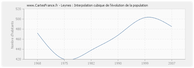 Cette courbe reprend l'historique de la population de Leynes de 1968 à 2007 en interpolation cubique. Ceci permet d'obtenir plus précisément la population de la commune de Leynes les années ou aucun recensement n'a été effectué.