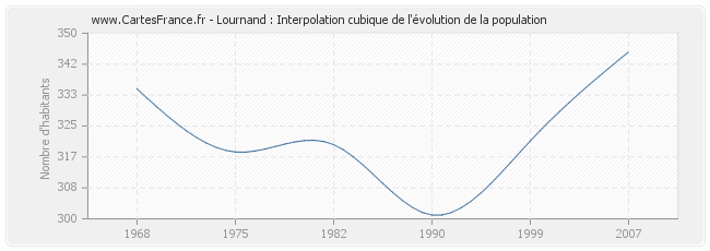 Cette courbe reprend l'historique de la population de Lournand de 1968 à 2007 en interpolation cubique. Ceci permet d'obtenir plus précisément la population de la commune de Lournand les années ou aucun recensement n'a été effectué.