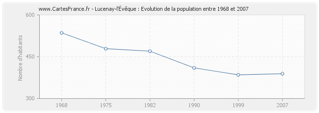 La population de Lucenay-l'Évêque était de 389 habitants en 2007, 385 habitants en 1999, 410 habitants en 1990, 470 habitants en 1982, 479 habitants en 1975 et 536 habitants en 1968.