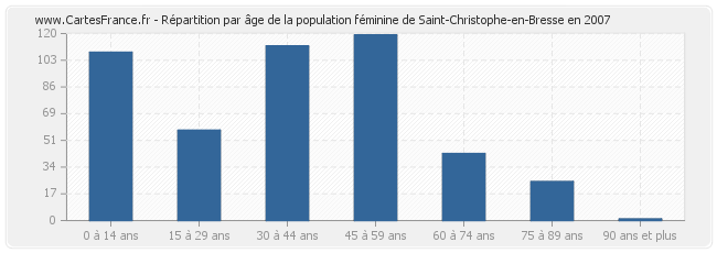 Répartition de la population féminine de Saint-Christophe-en-Bresse par âge en 2007 :