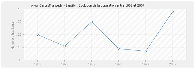 La population de Santilly était de 138 habitants en 2007, 107 habitants en 1999, 109 habitants en 1990, 130 habitants en 1982, 111 habitants en 1975 et 120 habitants en 1968.