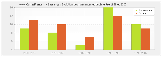 Sassangy : évolution des naissances et décès de 1968 à 2007